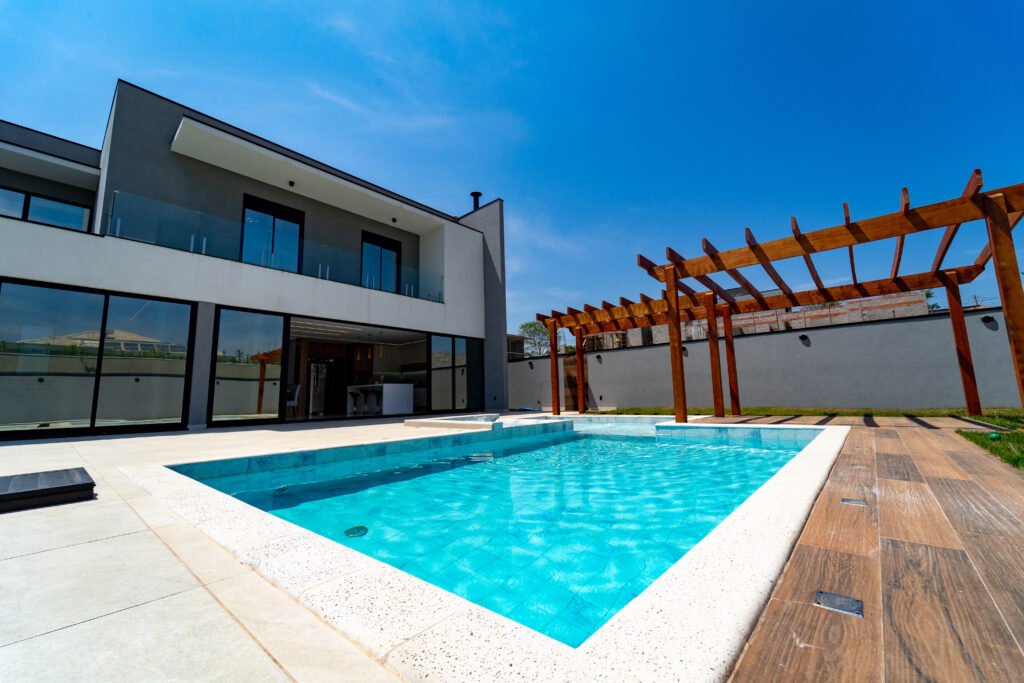 A cozinha planejada oferece excelente aproveitamento de espaço e se conecta perfeitamente à área externa, onde o lazer é protagonista. A casa possui uma piscina com 35 mil litros, equipada com aquecimento solar, pergolado integrado e um fogo de chão, perfeito para reunir amigos e família em momentos especiais.