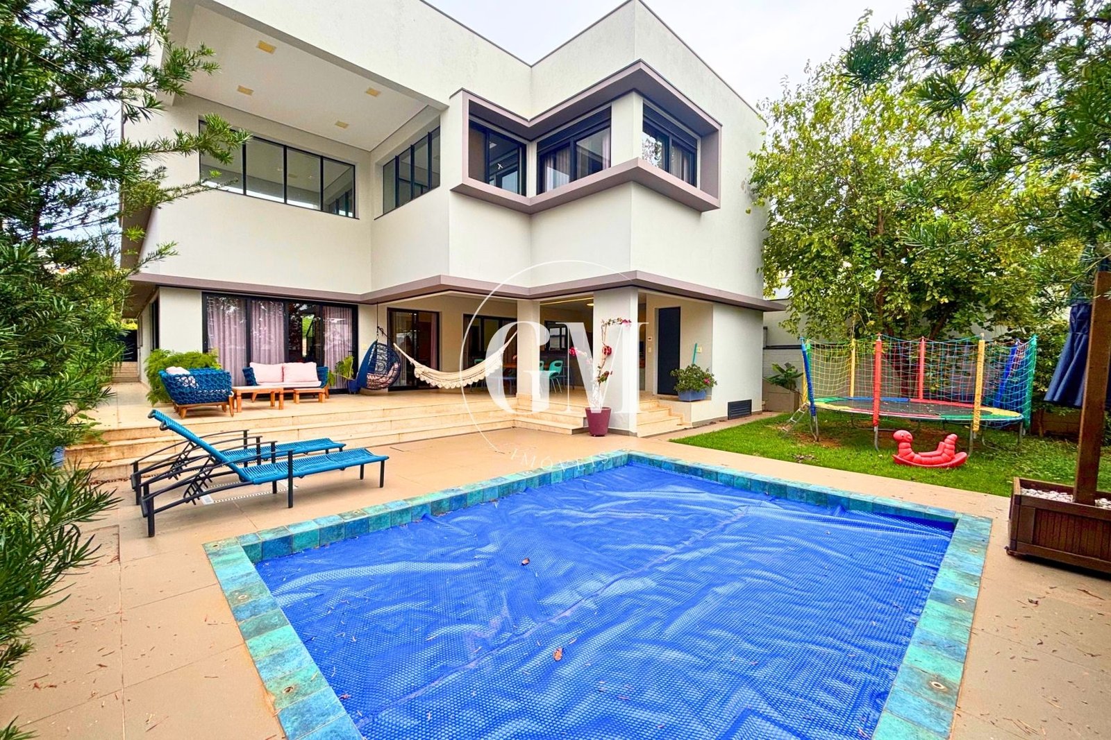 A área de lazer se destaca pela piscina com tratamento por ozônio, que oferece maior qualidade da água e reduz o uso de produtos químicos. O paisagismo traz identidade e afeto ao imóvel, com um pé de amora que acompanha a família desde 2013, jabuticabeiras no quintal e na calçada, além de árvores-de-fogo, que transformam o jardim com sua floração vermelha intensa.