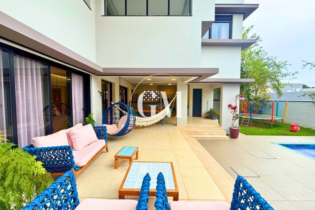 Os ambientes internos refletem um alto nível de acabamento e atenção aos detalhes. As bancadas da cozinha e do espaço gourmet são em granito Café Imperial, com acabamento polido e escovado, conferindo sofisticação e um visual diferenciado. A casa conta com marcenaria de alto padrão assinada pela Bontempo, todas as persianas automatizadas, ar-condicionado em todos os dormitórios e no escritório, além de piso de taco no pavimento superior, que adiciona aconchego e elegância à área íntima.