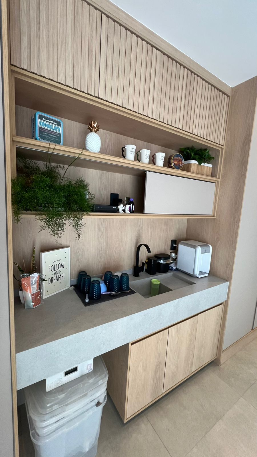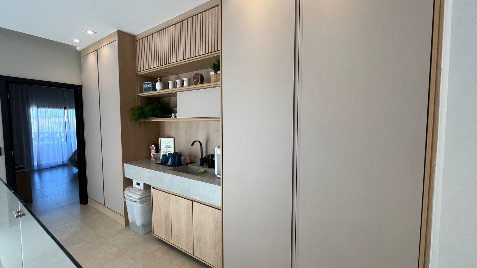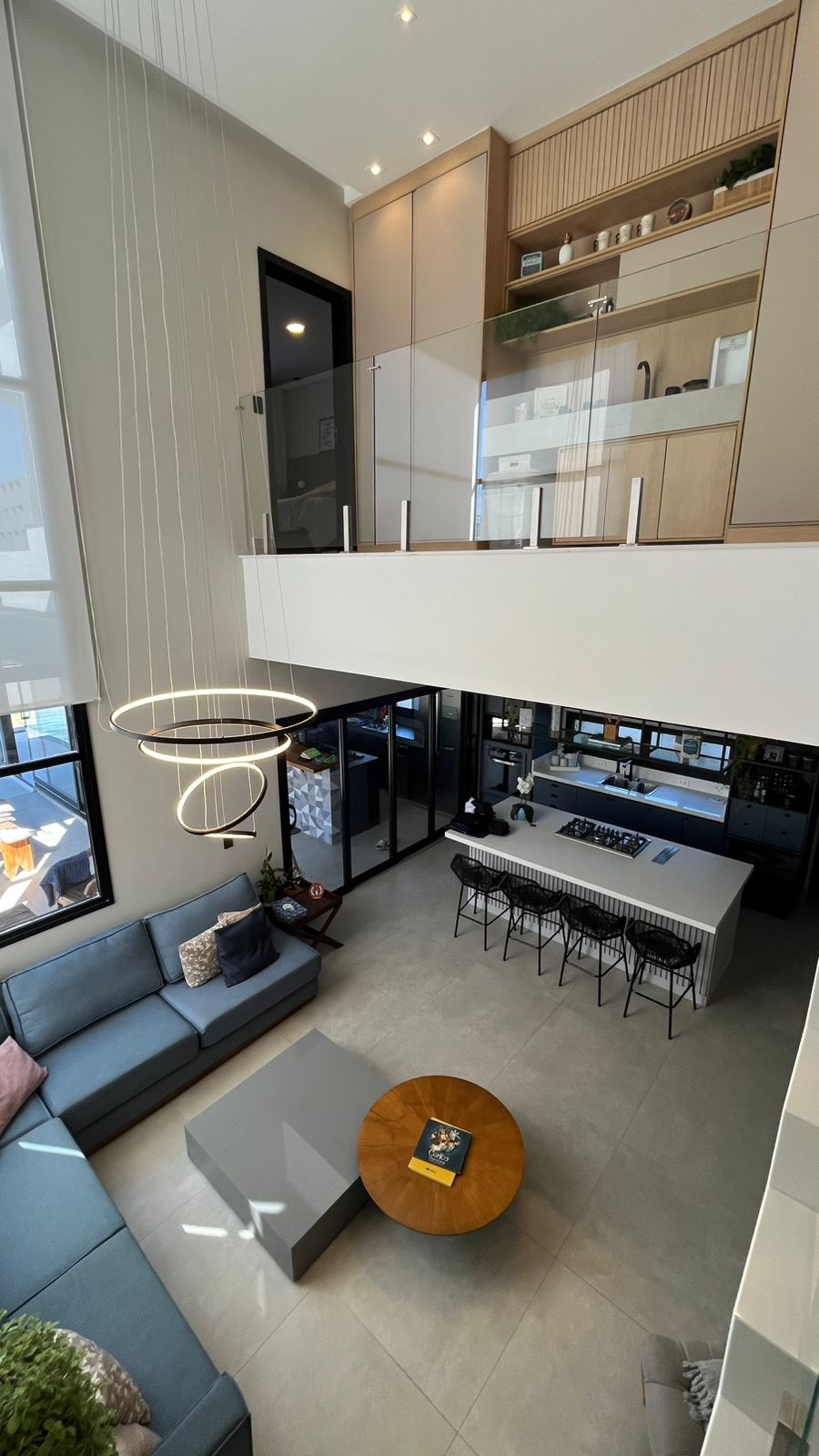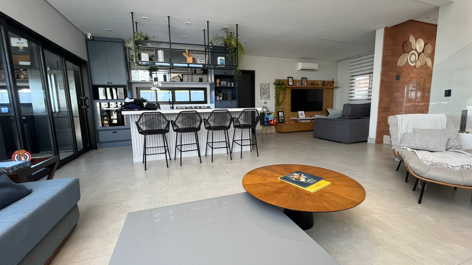 Sala com pé direito duplo (6m), sofá em L, adega 13 garrafas Brastemp, cristaleira, poltrona Costela e projeto luminotécnico