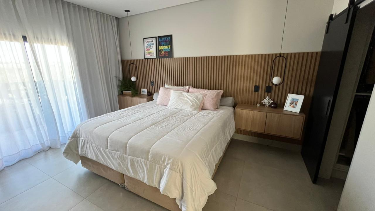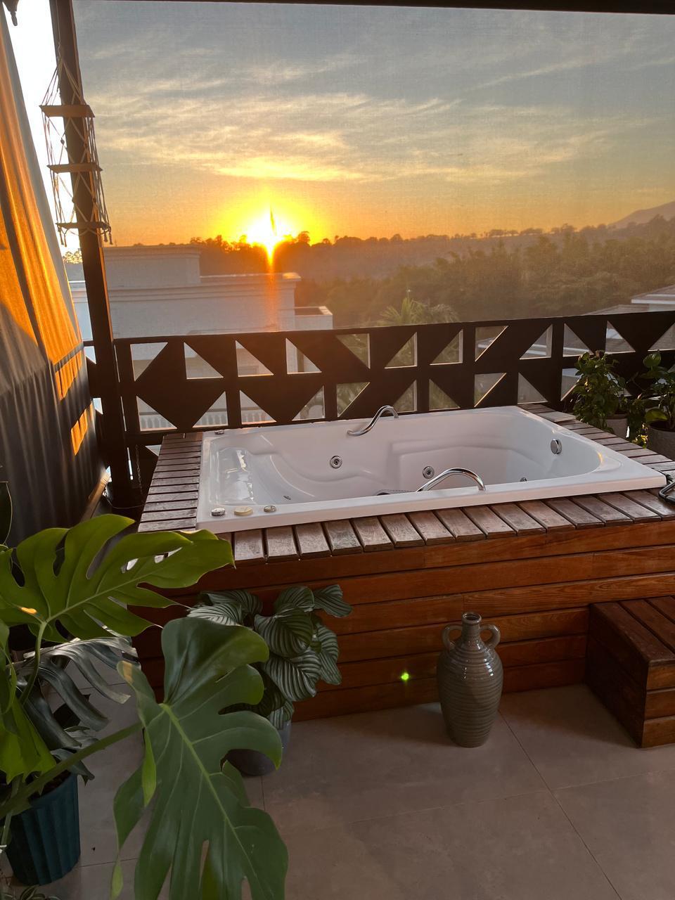 Suíte master com closet, marcenaria, varanda ampla com vista para a Serra do Japi, hidromassagem, cama king, TV 55, e projetos de marcenaria e iluminação assinada por design de interiores