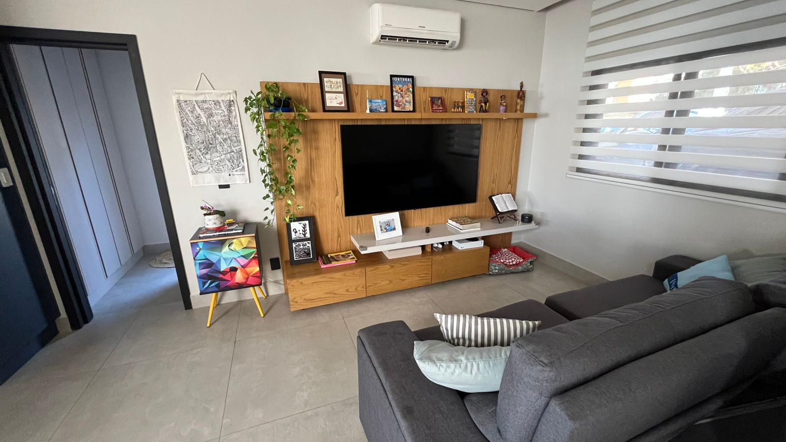 Home Theater com TV 55, ar-condicionado e sofá retrátil