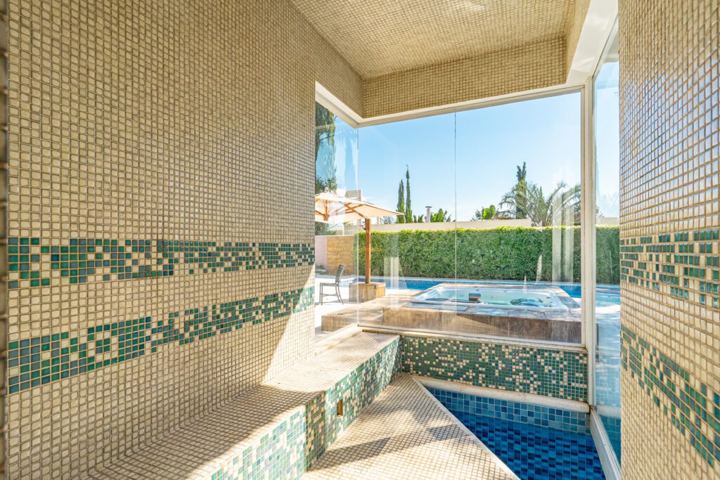 A área de lazer é um espetáculo à parte. Inclusive, a piscina com hidromassagem integra-se à sauna privativa e ao espaço gourmet, perfeito para momentos de convivência. Com isso, os moradores aproveitam um ambiente exclusivo para relaxar e receber amigos.