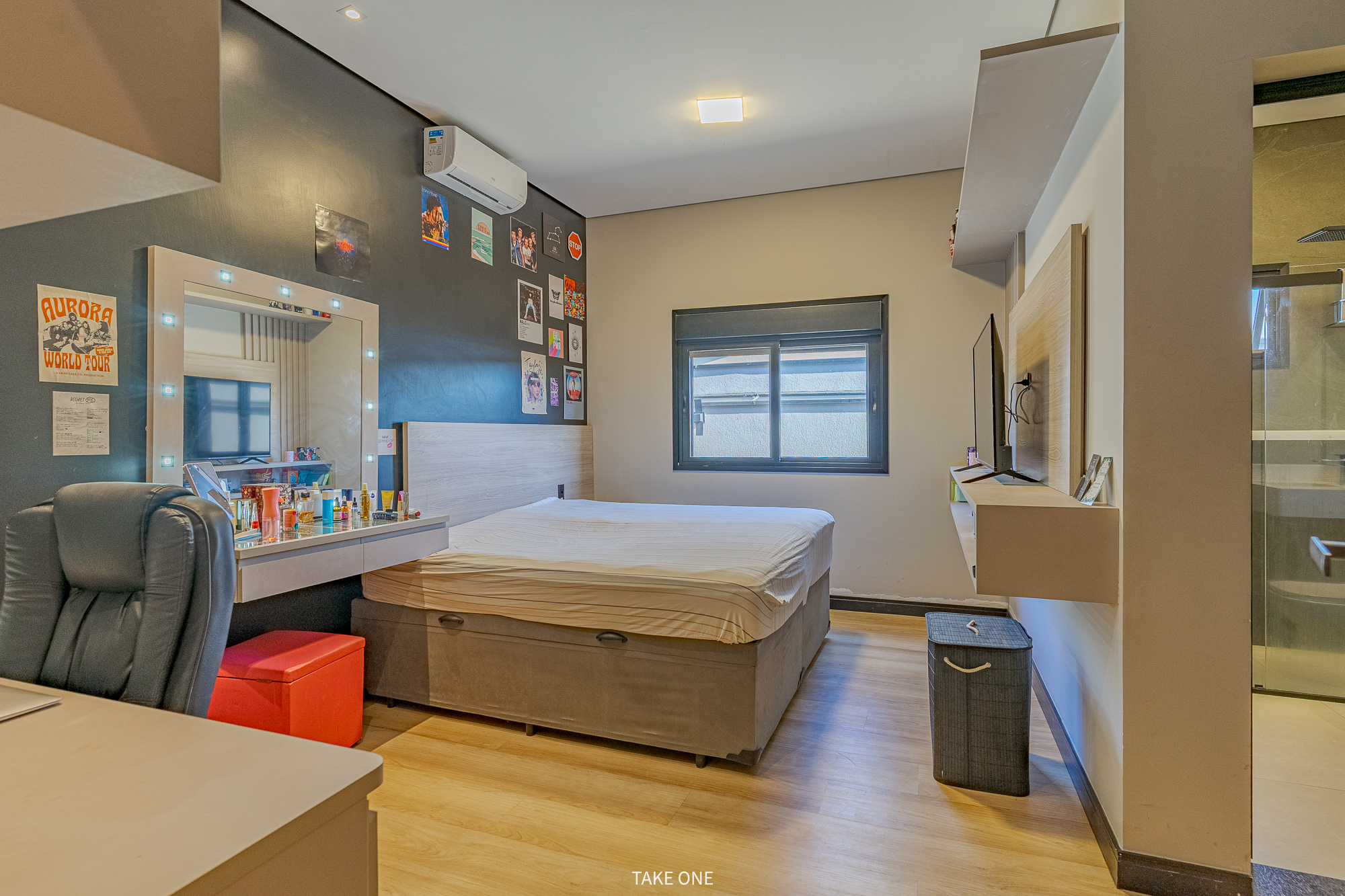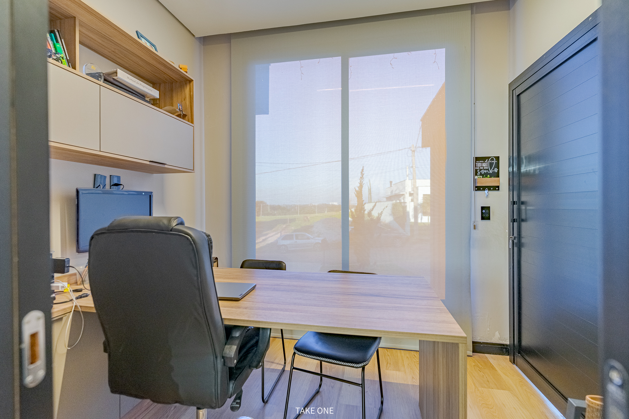 A área íntima dispõe de três suítes generosas, sendo todas delas com closet, e ar- condicionado, garantindo privacidade e conforto. Um escritório reservado complementa o layout, ideal para quem busca um espaço silencioso para trabalho ou estudos. A área social é ampla, integrada e acolhedora, conectando sala de estar, sala de jantar, cozinha planejada e área externa de forma elegante.